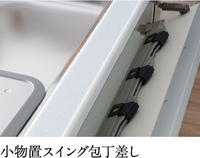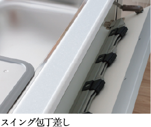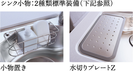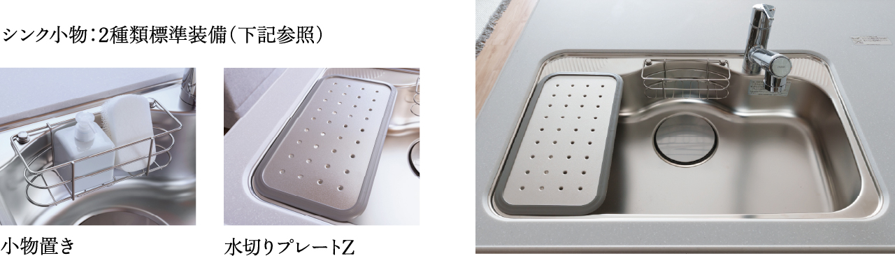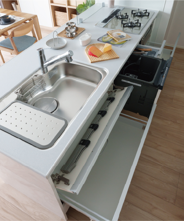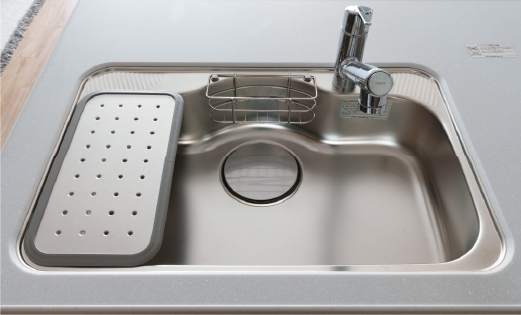 お鍋やフライパンを置けて、調理後にまとめて洗うことができるシンク。水切りプレートが付いたタイプは、まな板を置いたりと、作業スペースをカスタムできます。
