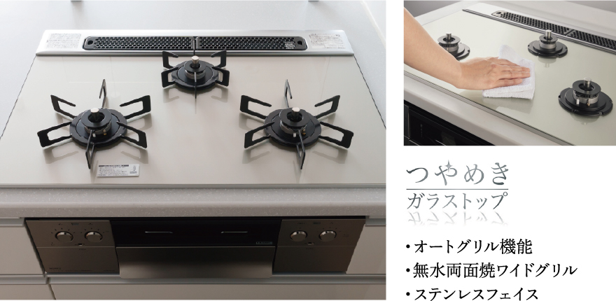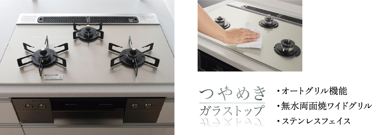 便利で安心な機能が充実しているビルトインコンロ。天板は見た目が美しく、耐久性にも優れたガラストッププレート。お手入れも簡単です。