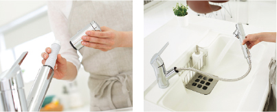 水栓のヘッドが引き出せ、洗髪もラクにできるリフトアップのシャワー水栓を採用。背の高い物への水汲みや洗面ボウルのお掃除にも便利です。
