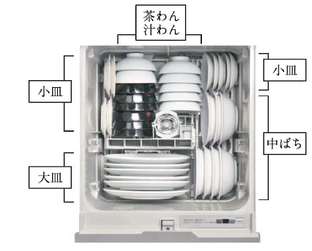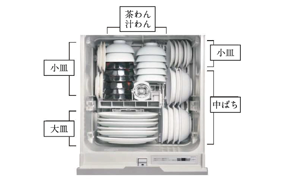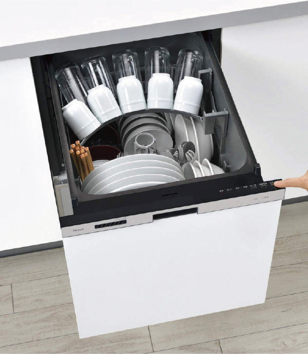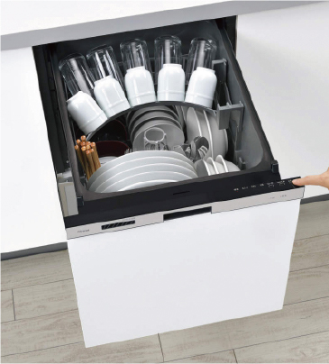 シンプルな機能を備えた食器洗い乾燥機。食器カゴの見直しで、まな板をはじめ食器が収納しやすく、限られたスペースで多くの洗い物に対応できます。