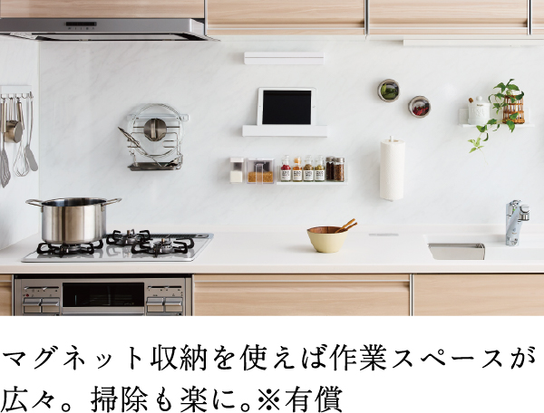 熱に強く汚れが染み込まないため、水まわりやコンロ周りに最適な素材です。気になる汚れもサッとひと拭き。キレイなキッチンが保てます。