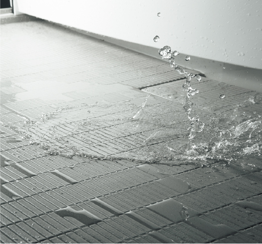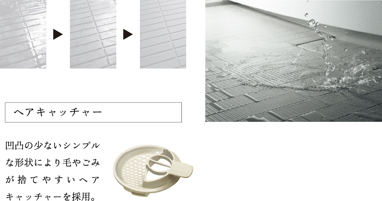 水の表面張力を壊す特殊な加工がされた、乾きやすい床。従来よりも滑りにくく安全です。また同一方向にそろうグリッド加工によって見た目も美しく、掃除もしやすい形状です。
