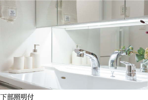 三面鏡の裏側は、化粧小物などを収納できるキャビネットになっています。取り出しやすくお洒落に整理整頓できます。三面鏡の下部には手元照明を内蔵しています。