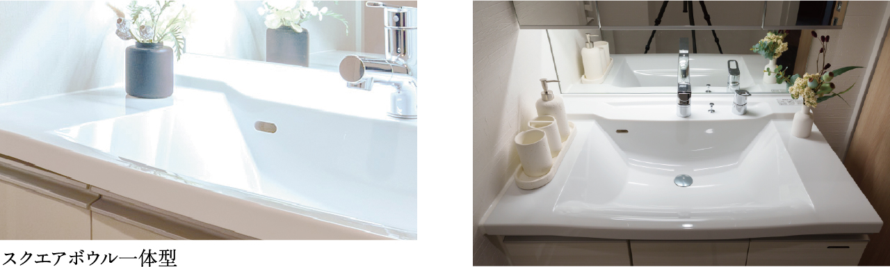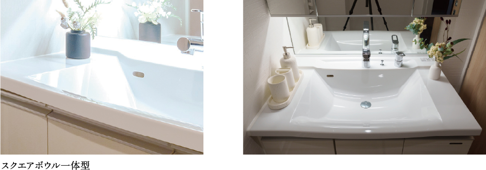 人造大理石の樹脂部分がアクリル100%という高純度で傷つきにくいボウル・カウンターは、広々とした奥行きで使いやすく、汚れや水アカのたまりやすい隙間がない一体型だから、お手入れも簡単です。