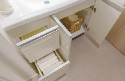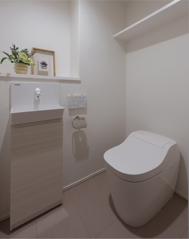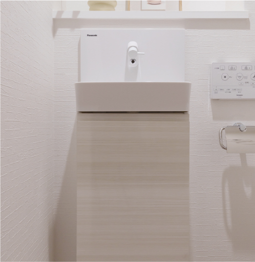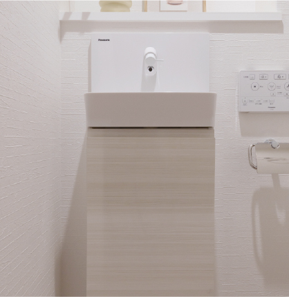 便器と同じ「スゴピカ素材」で、サッとふくだけでキレイに保てます。キャビネットには、ちょっとした小物が収納可能です。