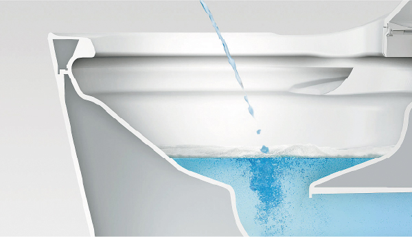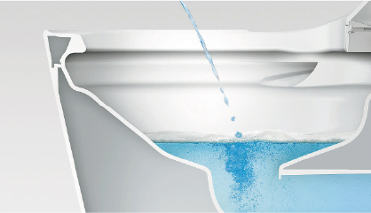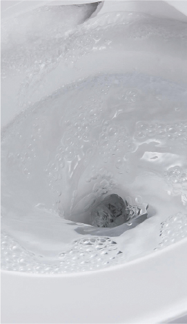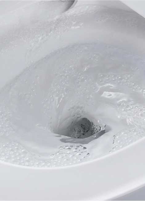 便座を上げる、またはボタンを押すと水位が下がり、水面全体に泡が出現。トビハネをおさえ、床や壁などへの汚れを抑制します。
