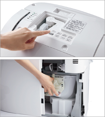 9Vアルカリ乾電池をセットし、本体上部にあるスイッチを押せば排水できます。停電時はサイドカバー内にある手動ハンドルを回して流すこともできます。