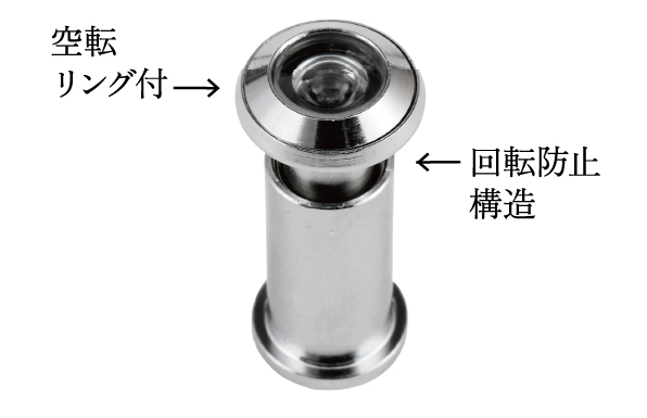ドアスコープを外しての不正解錠を防止する空転リングと本体の回転防止構造を採用しています。